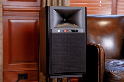 We tested the JBL 4329P powered speaker system in multiple environments. First, we put them in a living room on the matching JS80 speaker stands. These stands are low profile and put the speakers at the perfect height and at a great angle for a typical sofa or listening chair.