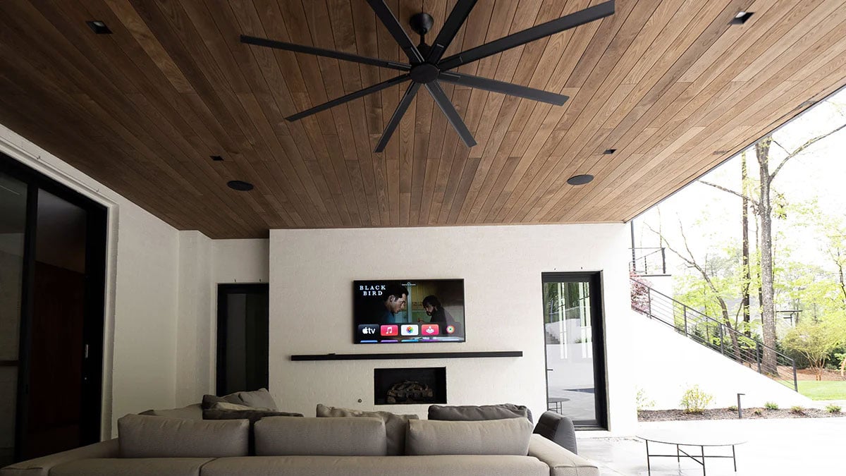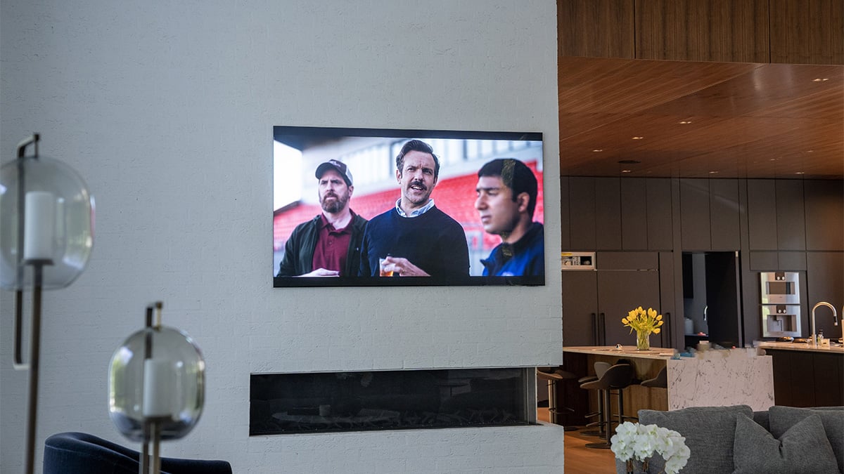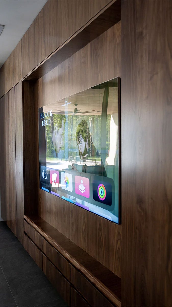 As you continue to explore downstairs, you’ll find an expansive living room area with another 85-inch Samsung TV that is flush against a wall of beautiful woodwork. To keep the minimal design, we’ve installed two Bowers & Wilkins in-ceiling speakers directly above to give you great high-performance audio. As you pan left, there is a massive sliding window wall that opens up to the outdoor pool and lounge area. Outside, we’ve installed four Bowers & Wilkins in-ceiling speakers that play the sound from the Samsung Terrace TV that we’ve installed above the outdoor fireplace.