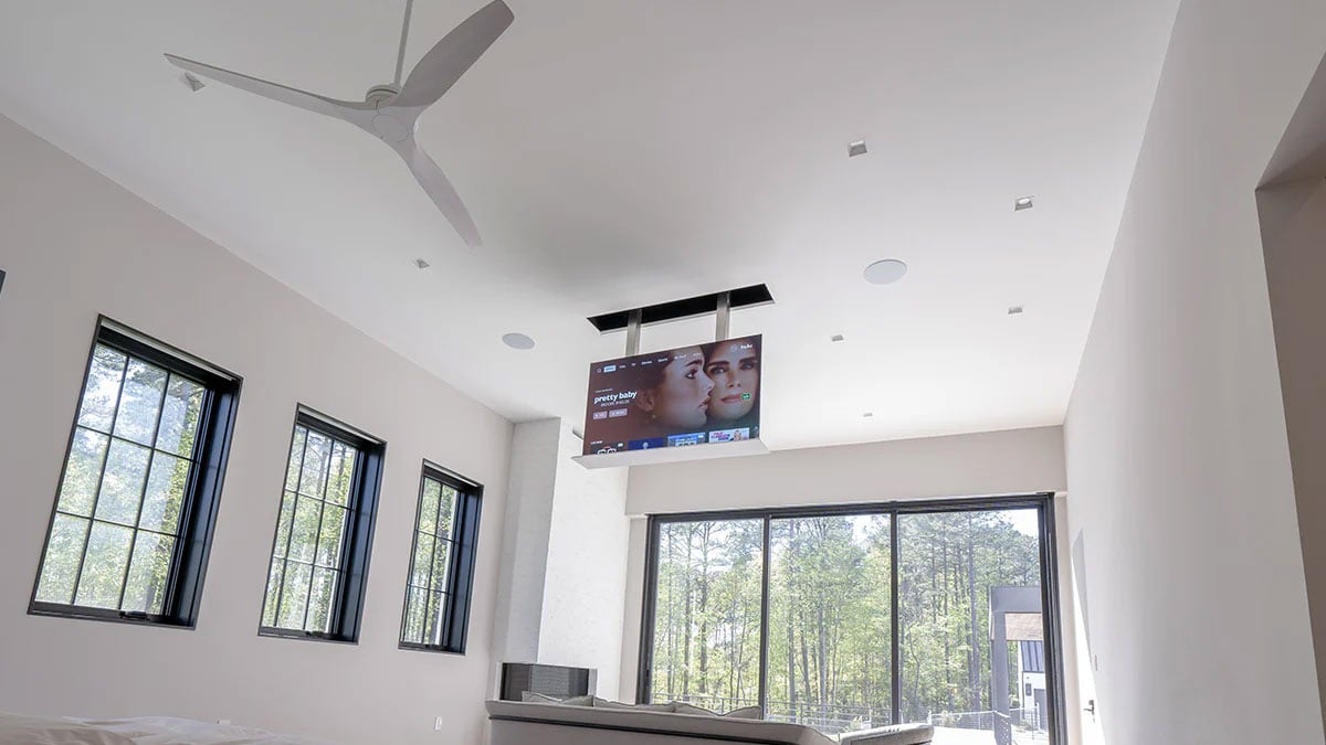 In the master bedroom, we’ve designed each window with motorized shading that includes a sheer shade that automatically comes down, and then a blackout shade that can also come down to darken the room completely. To keep a super clean look, we’ve installed a custom TV drop down system where a 65-inch Samsung TV comes out of the ceiling and hangs in front of the bed. The homeowner can press one button and the blackout shades will drop down along with the TV and have a perfect movie night in their bedroom. Paired up with this are Bowers & Wilkins CCM-382 in-ceiling speakers to keep that clean look but provide clear and detailed sound.