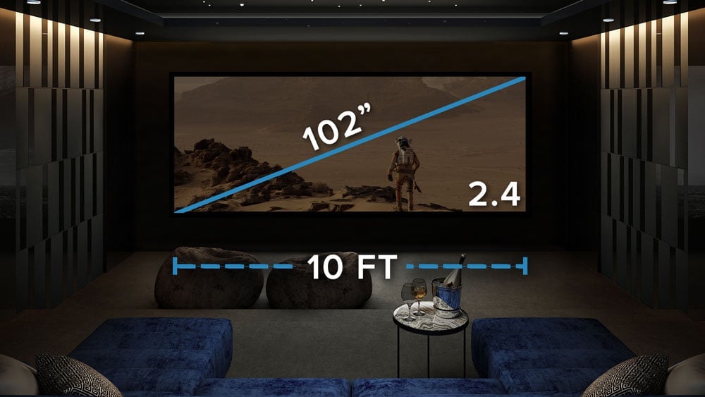 The way this works is pretty neat. First, you obviously need a front projection screen that is in the aspect ratio of 2.40. If you are picking out the best size for your screen, check out our free home theater design tool where you can design the screen size to best fit your space and desired level of immersion. The tool will show you the ideal sizes for your room size and the location of your seats. Also, be sure to check out our article on how to choose the best home theater screen size.