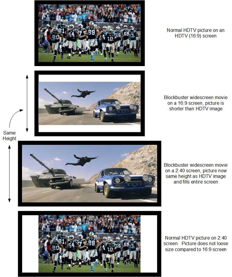 To get the best experience for both 16:9 news and sports, and still enjoy the full 2.40 widescreen for movies, you first set up your projector to perfectly fill your screen from top to bottom with a 16:9 image. You then save that lens position as your 16:9 in your projector. Yes, you do not lose any size on 16:9 when you go with widescreen in almost all cases (more on this later). Then, when you project a 2.40 movie on your screen, you will observe that it does not fill the screen anywhere. You will then use your projector remote to zoom out the picture until you completely fill your 2.40 screen with your 2.40 movie. Next, save that position as your 2.40 position in the projector. You can now choose which position you want depending on the type of content you are watching.