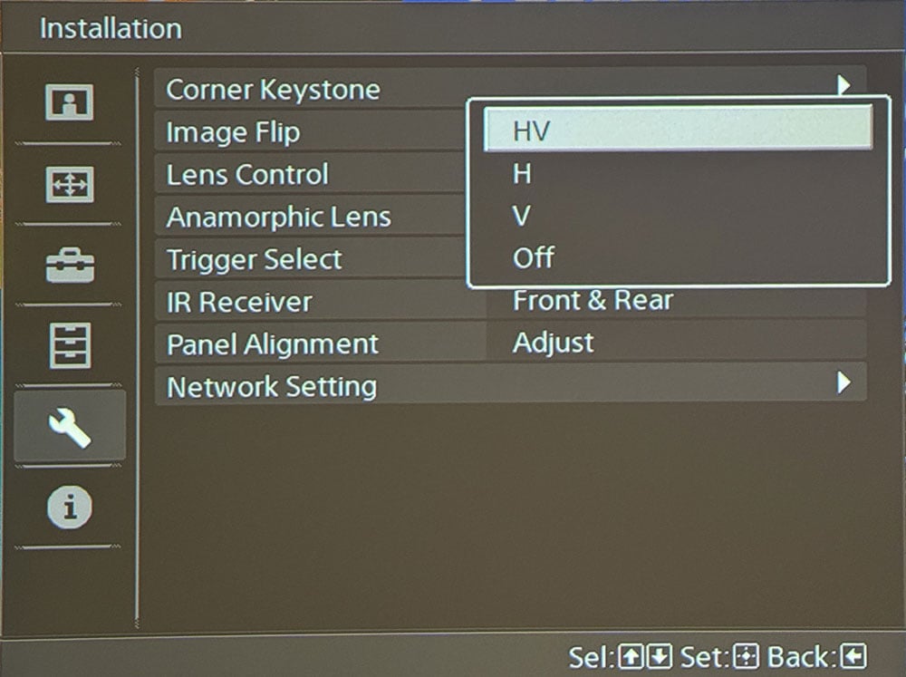 We suspect most of you will mount your new Sony on the ceiling. If this is the case, you can access the Insallation menu and select “HV” to flip the image or keep it “off” if you want to adjust the settings with it sitting on it’s feet.